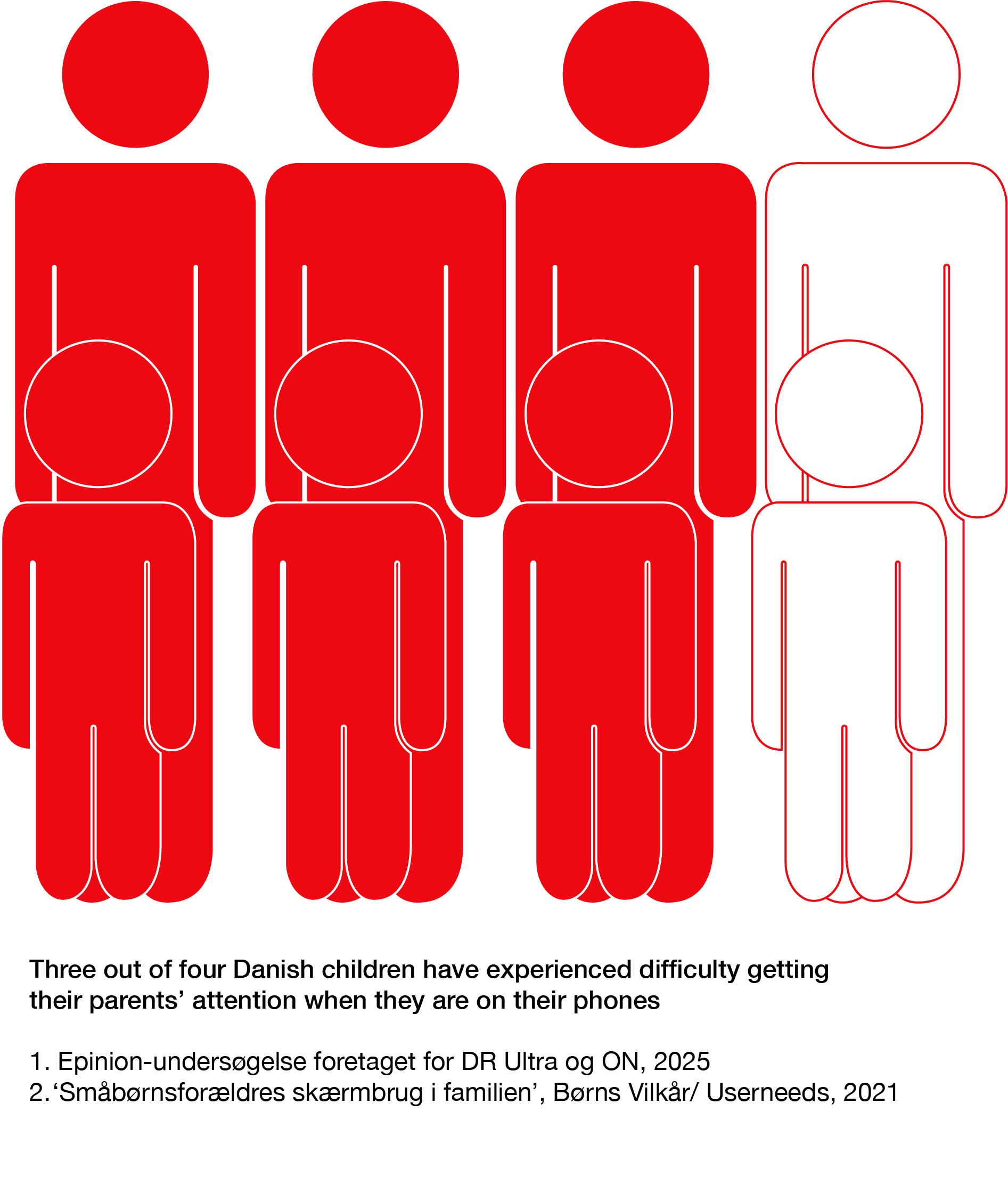 Many parents worry about their children spending too much time on their phones. But the problem goes both ways. According to a recent study, three out of four Danish children have experienced difficulty getting their parents’ attention when they are on their phones¹. In fact, four in ten Danish parents spend more than two hours a day on digital media while their children are awake and present².